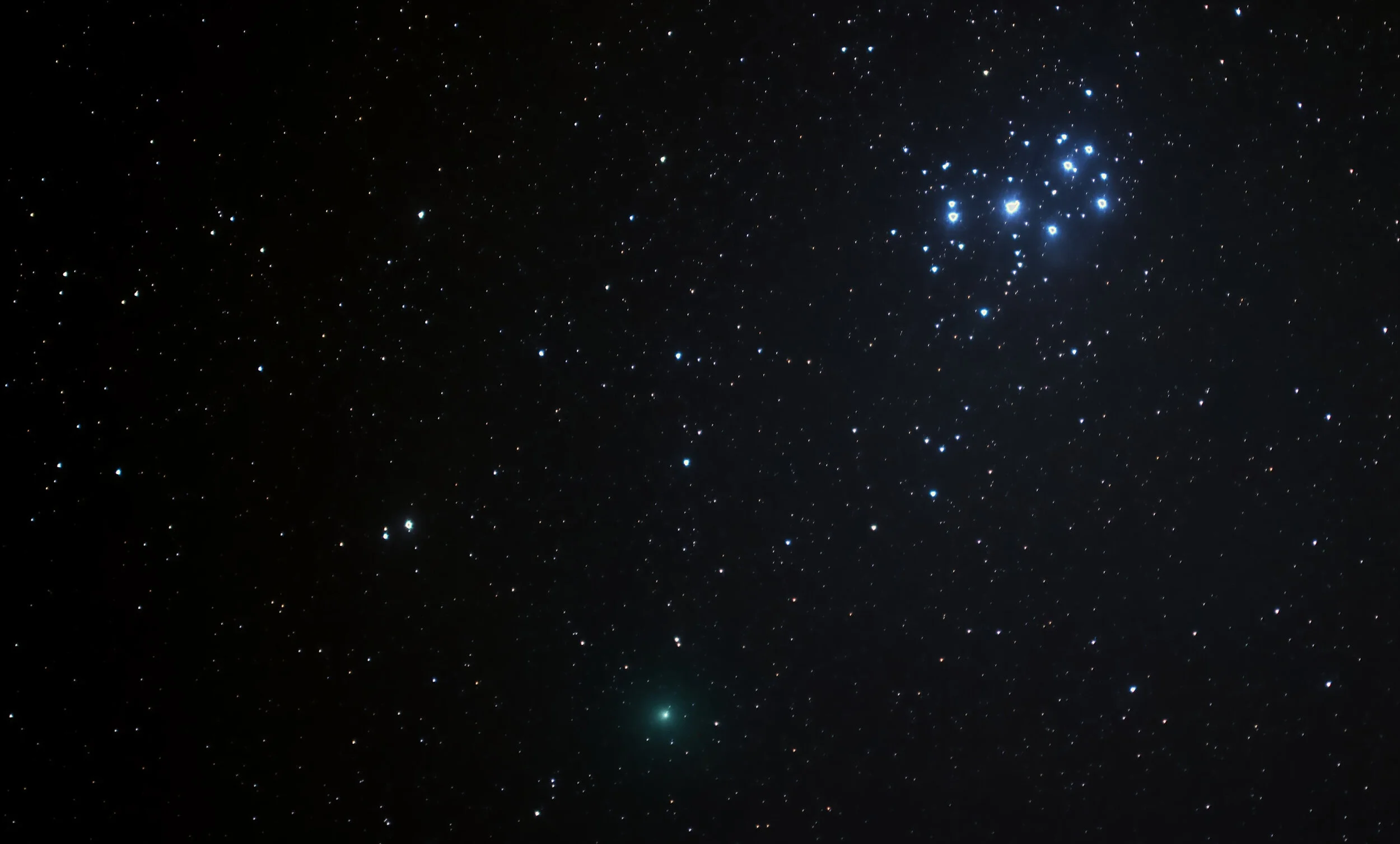 The pleiades star cluster is a lovely binocular object. this photo - taken on feb. 4, 2019 - includes the comet 46p/wirtanen, which shows up as a green spot at bottom centre. - john mcphee